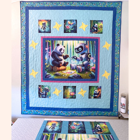 Panda & Robot Quilt Panel – Stitched Together Friendship Story Panel for Quilters