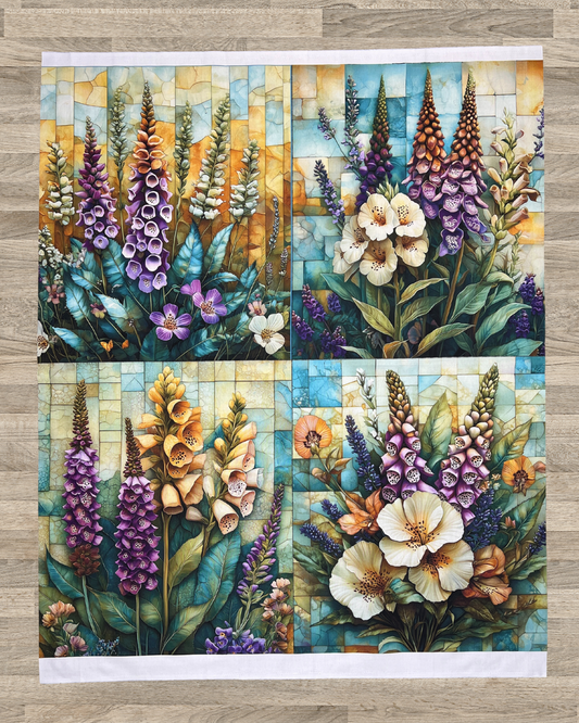 Foxglove & Lavender Botanical Quilt Panel – Set of 4 Blocks | 100% Cotton (36" x 42")