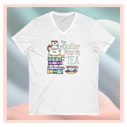 This Quilter Runs on Tea V-Neck T-Shirt – Funny Quilting Shirt for Tea-Loving Stitchers