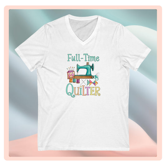 Full-Time Quilter V-Neck T-Shirt – Funny Sewing Shirt for Retired or Passionate Quilters