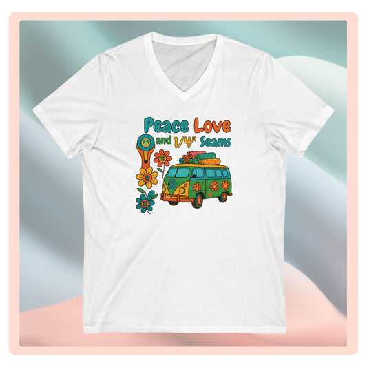 Peace Love and 1/4" Seams V-Neck T-Shirt – Retro Quilting Tee for Groovy Stitchers