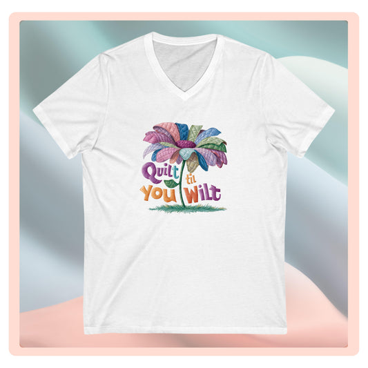 Quilt ’til You Wilt V-Neck T-Shirt – Funny Floral Quilting Tee for Dedicated Stitchers