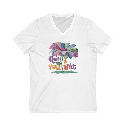 Quilt ’til You Wilt V-Neck T-Shirt – Funny Floral Quilting Tee for Dedicated Stitchers