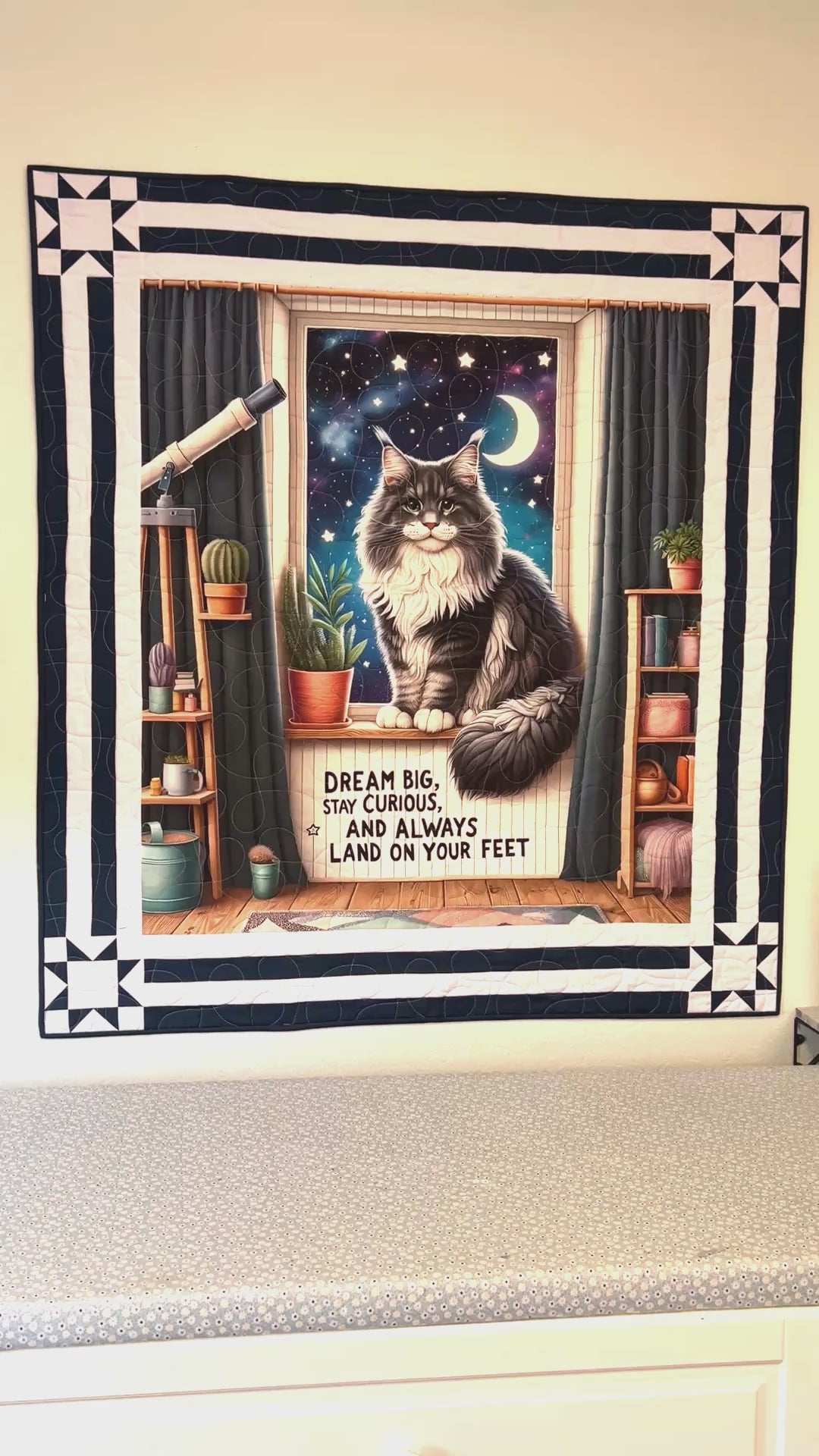 For cat lovers, quilters, and dreamers alike—meet the Dream Big Cat Quilt Panel! This stunning 100% cotton fabric panel features a majestic Maine Coon cat perched on a windowsill, gazing into a dreamy night sky filled with stars and a crescent moon. Below, an inspiring message reads: "Dream Big, Stay Curious, and Always Land on Your Feet."