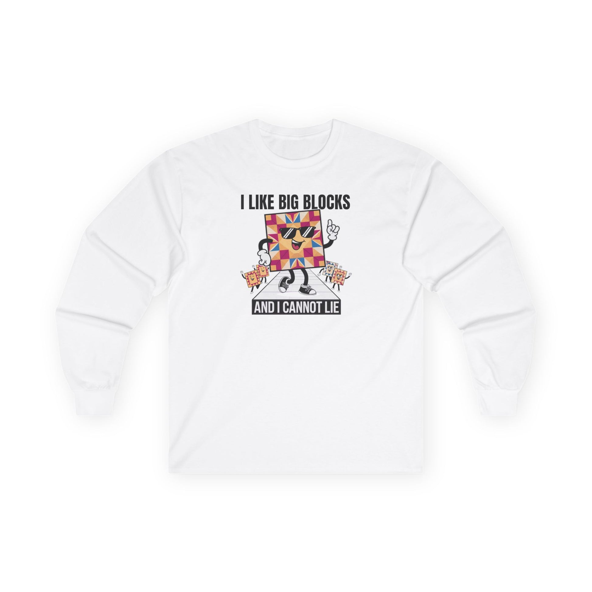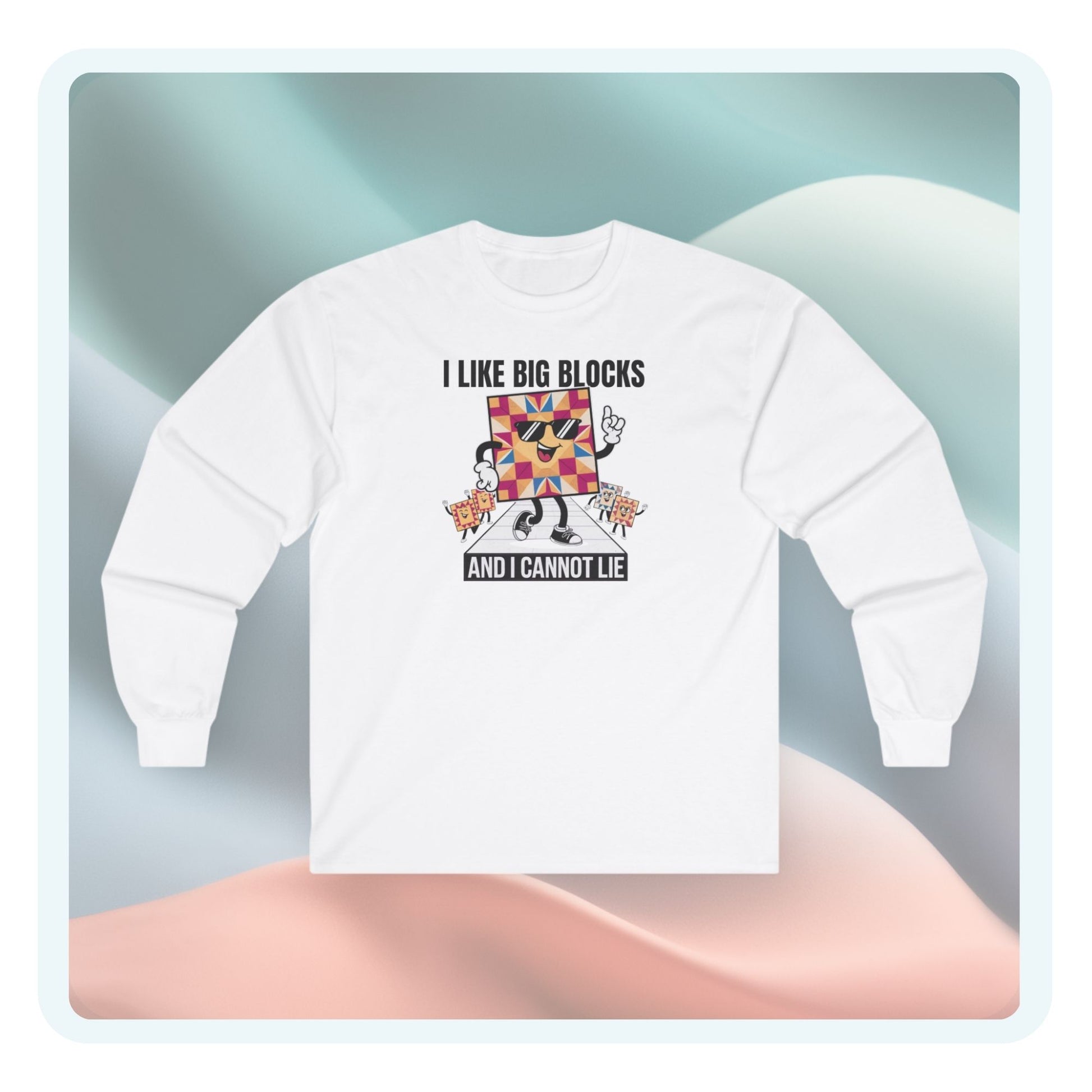 Quilters, get ready to groove! This playful long-sleeve tee features a quirky quilt block character and the hilarious phrase 'I Like Big Blocks and I Cannot Lie.' A must-have for quilting enthusiasts with a sense of humor!