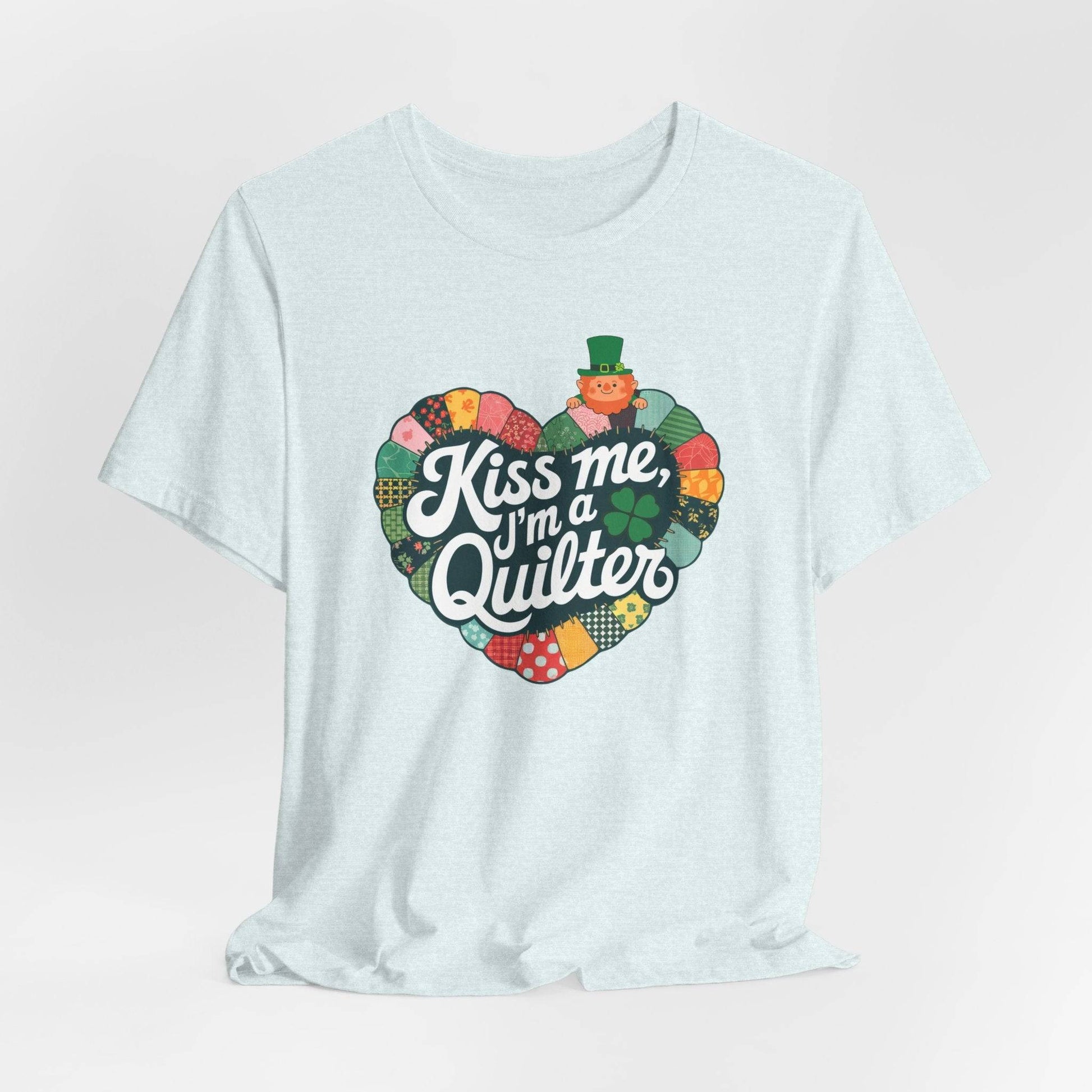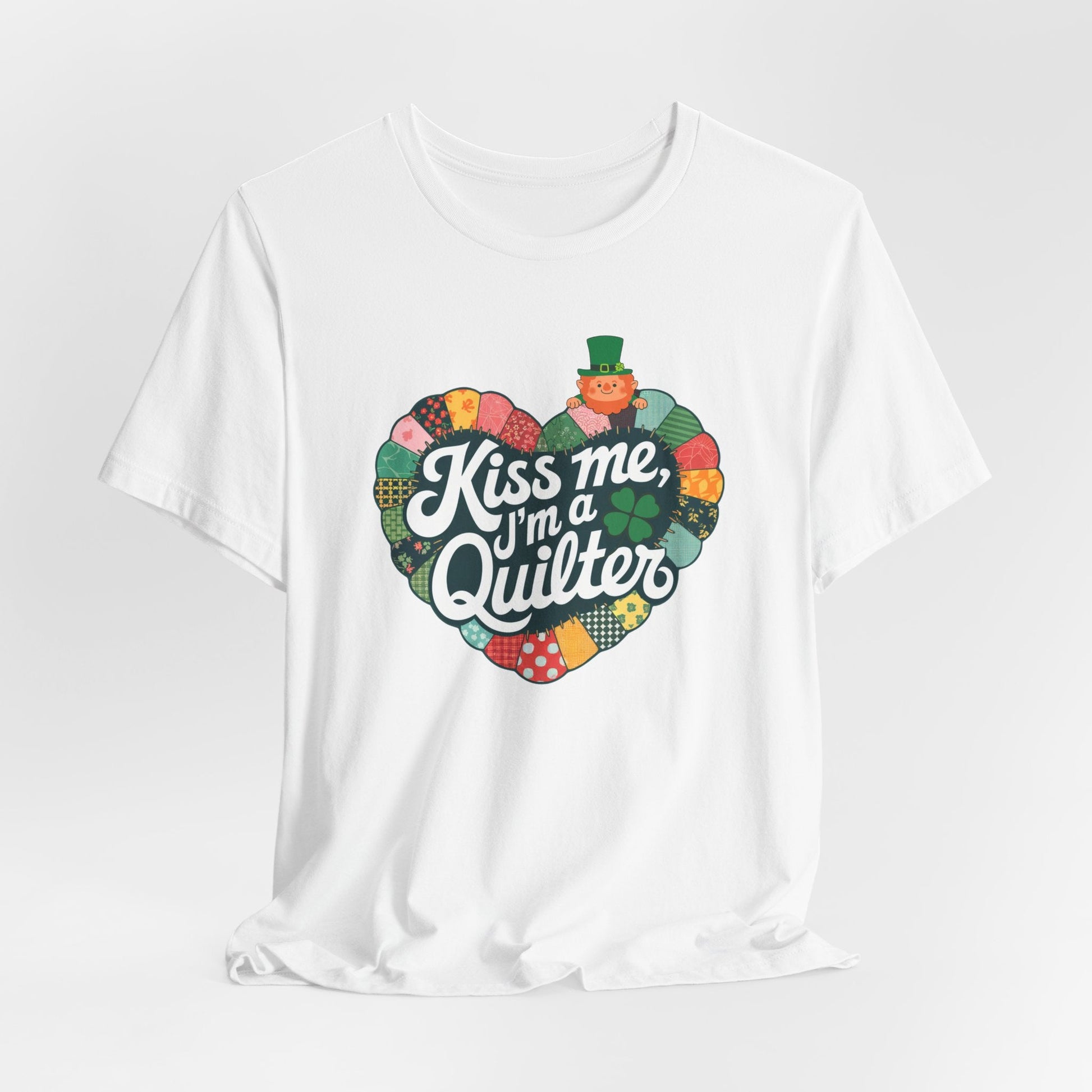 Celebrate St. Patrick’s Day with quilting charm! This festive short-sleeve tee features a heart-shaped patchwork design with shamrocks, a lucky leprechaun, and the phrase 'Kiss Me, I’m a Quilter.' A perfect way to stitch some Irish spirit into your wardrobe!