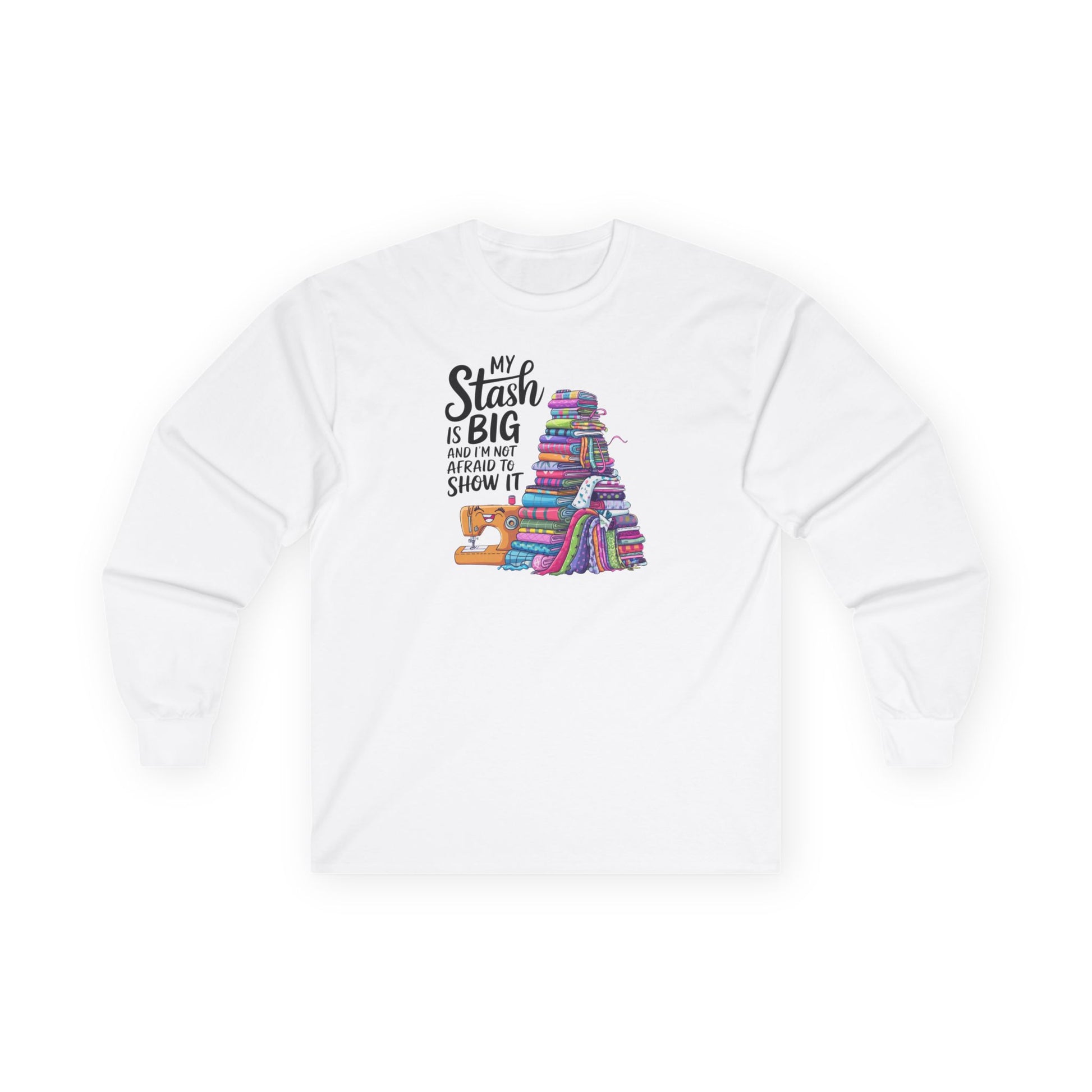 Show off your quilting pride with this playful long-sleeve tee! Featuring a colorful stack of fabric, a sewing machine, and the phrase 'My Stash Is Big and I’m Not Afraid to Show It,' it’s perfect for fabric lovers and quilting enthusiasts.
