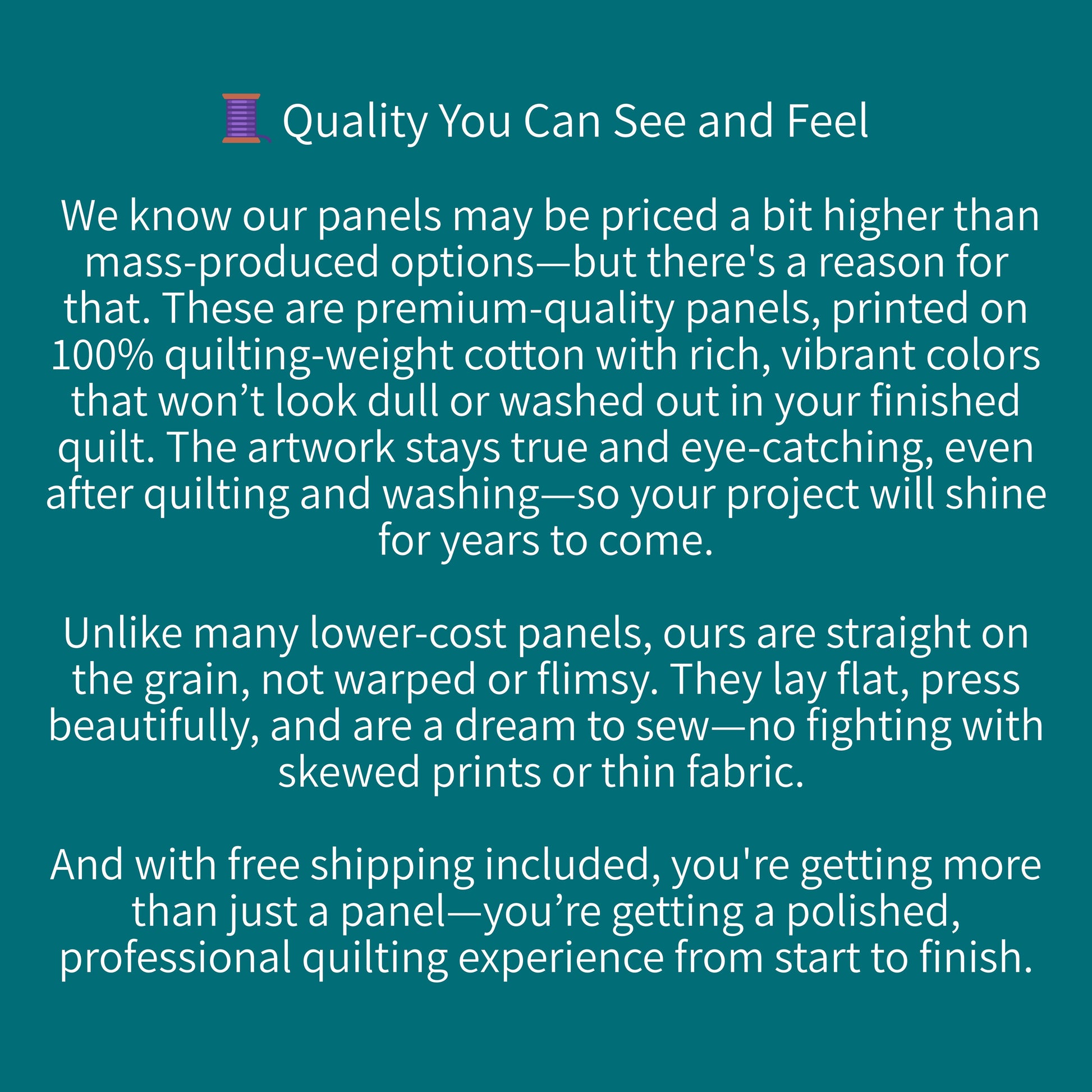 We know our panels may be priced a bit higher than mass-produced options—but there's a reason for that. These are premium-quality panels, printed on 100% quilting-weight cotton with rich, vibrant colors that won’t look dull or washed out in your finished quilt. The artwork stays true and eye-catching, even after quilting and washing—so your project will shine for years to come.