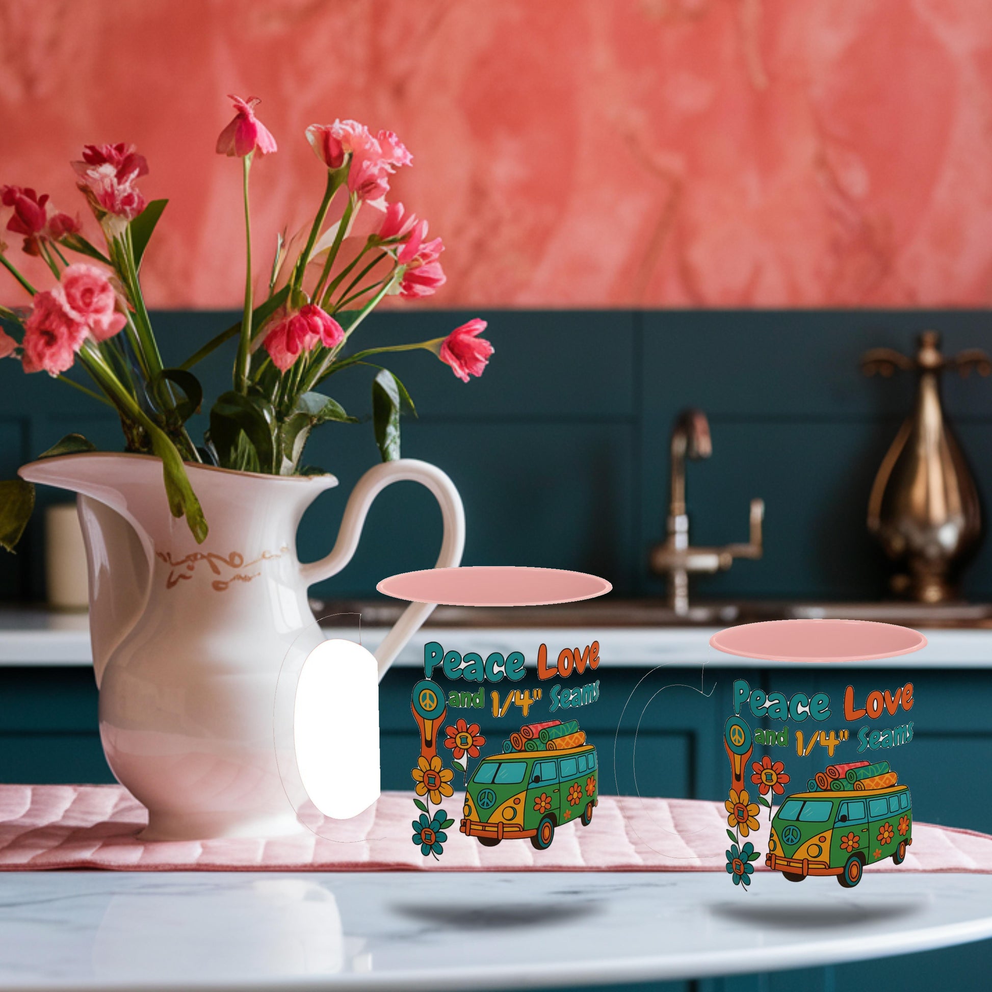 Get groovy with your stitching routine! This vibrant quilting mug is a throwback to flower power and fabric stacks, featuring a retro van piled high with colorful quilts and the phrase every true quilter lives by: Peace, Love, and 1/4" Seams.