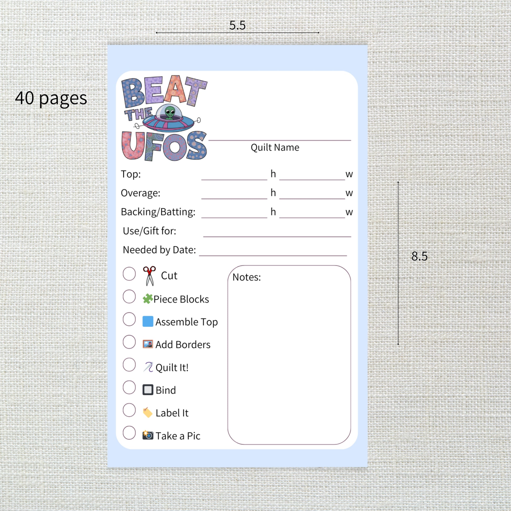 🛸 Beat the UFOs! Keep your quilting projects organized and finally tackle those Unfinished Objects (UFOs) with this 5 1/2" x 8 1/2" 40-page fun and practical handmade quilting planner notepad! Designed for quilters who have multiple WIPs (Works in Progress), this whimsical alien-themed quilt tracker will help you take control of your fabric-filled galaxy.