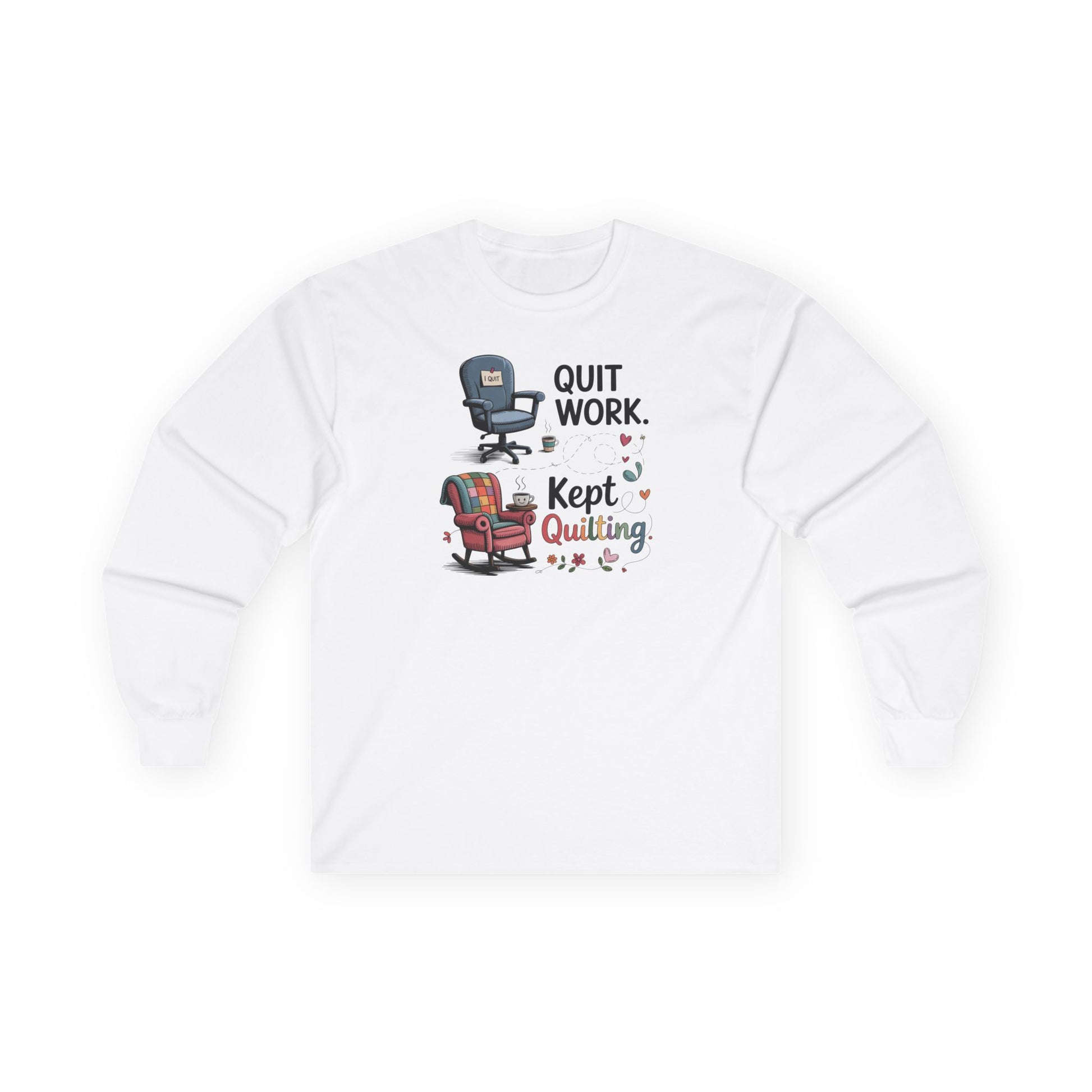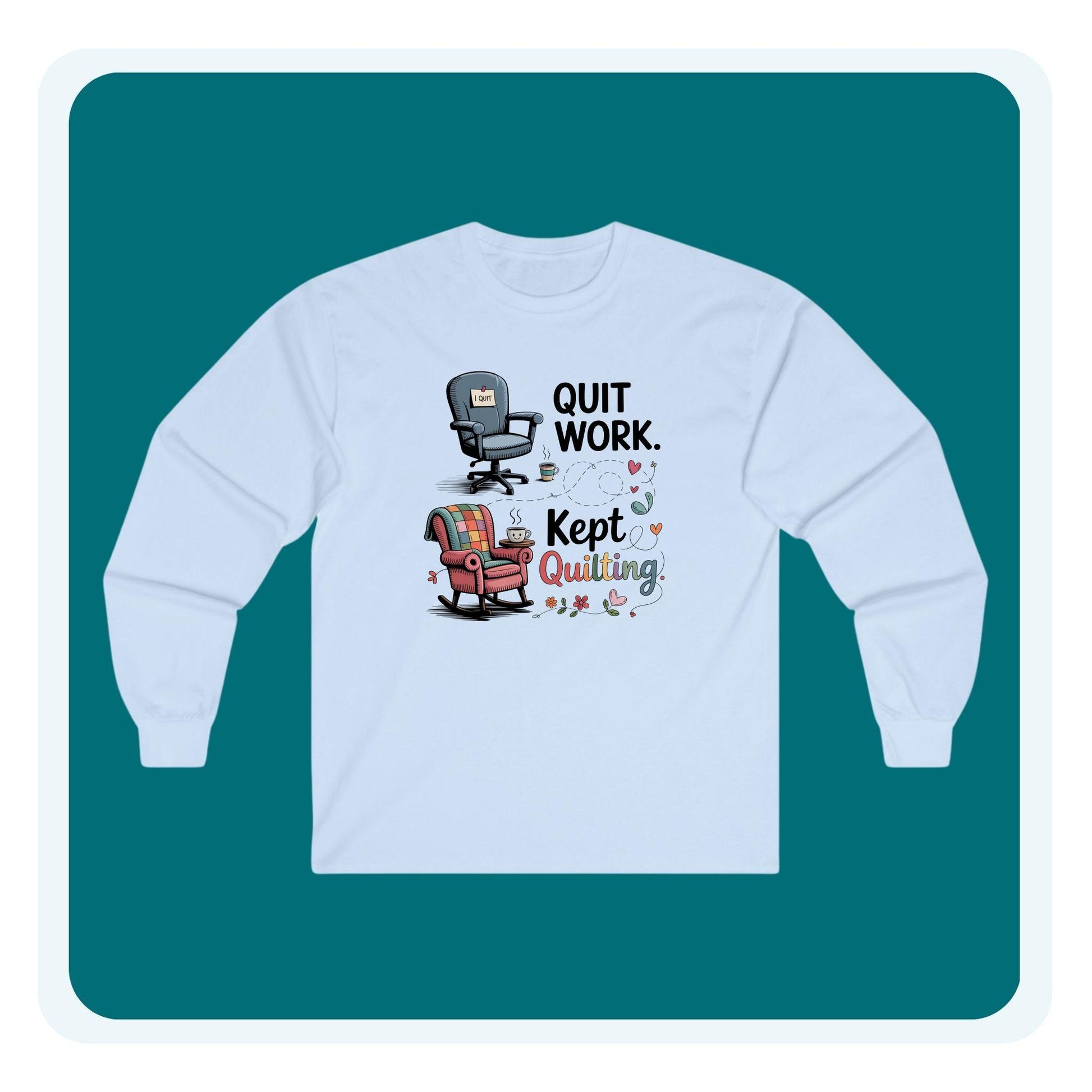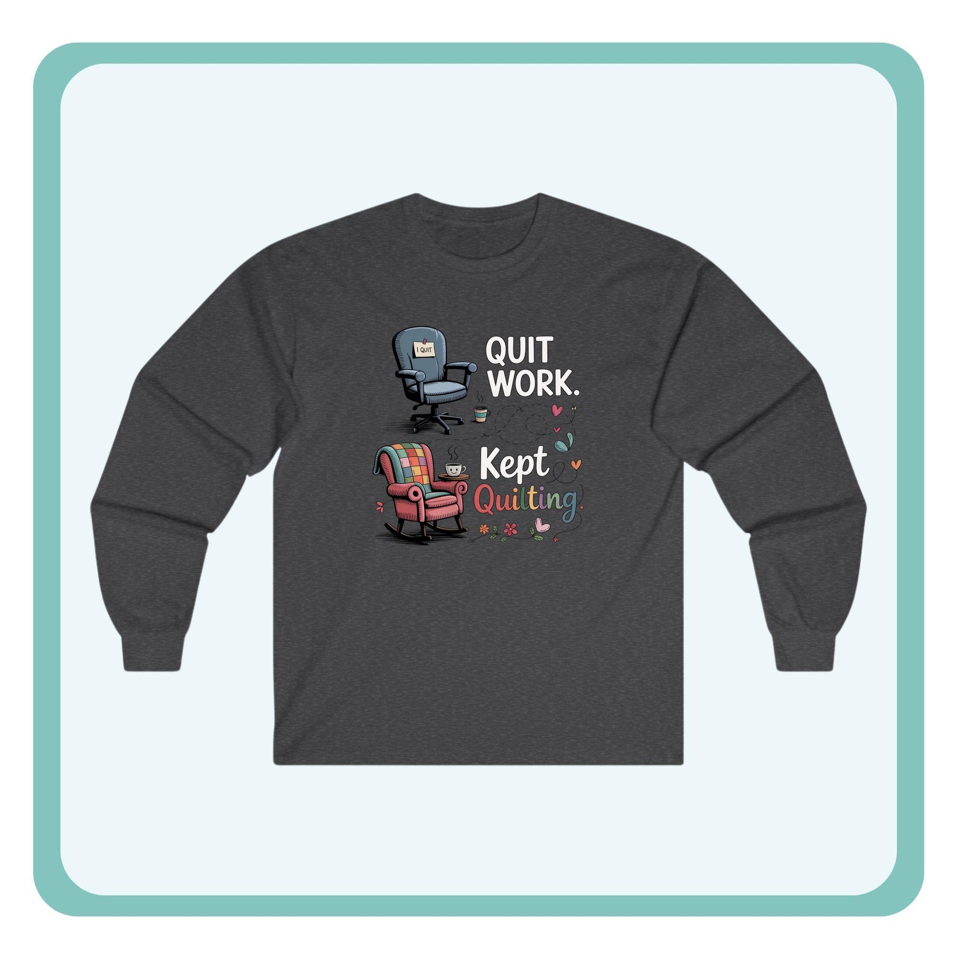 Show the world what retirement is really for with our Quit Work. Kept Quilting. long sleeve shirt. Featuring a fun design of an office chair swapped for a cozy armchair with a quilt, this tee is the perfect retirement uniform for quilters. Soft, comfortable, and full of personality, it’s ideal for guild meetings, retreats, or just stitching at home. A fun quilting gift for retirees who traded deadlines for fabric lines.