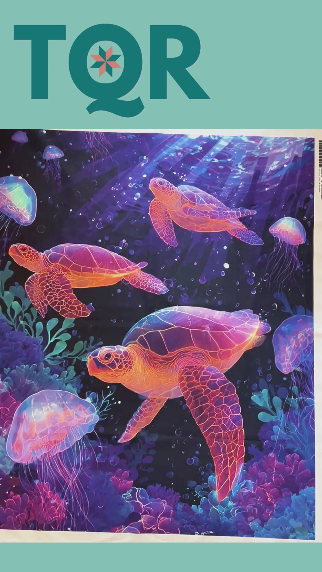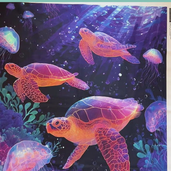 ✨ Dive into the deep with our Sea Turtle Glow Quilt Panel, a mesmerizing underwater design that feels like swimming through a neon reef at night! 🌊🐢