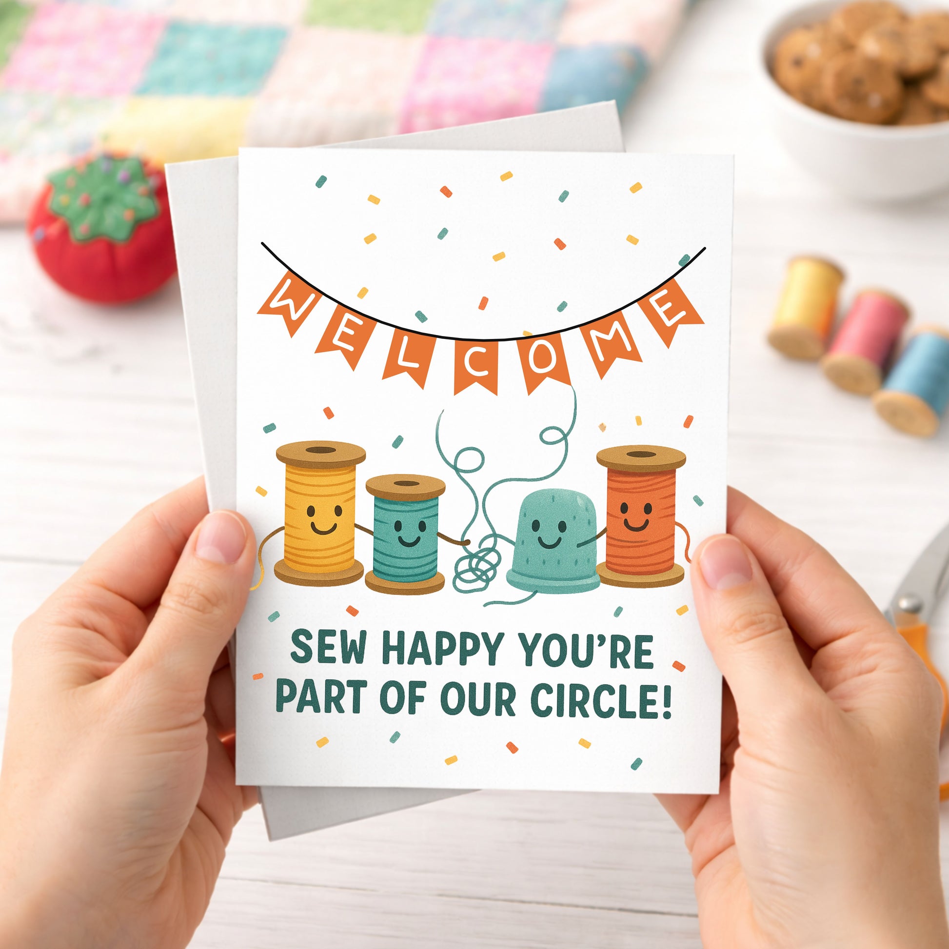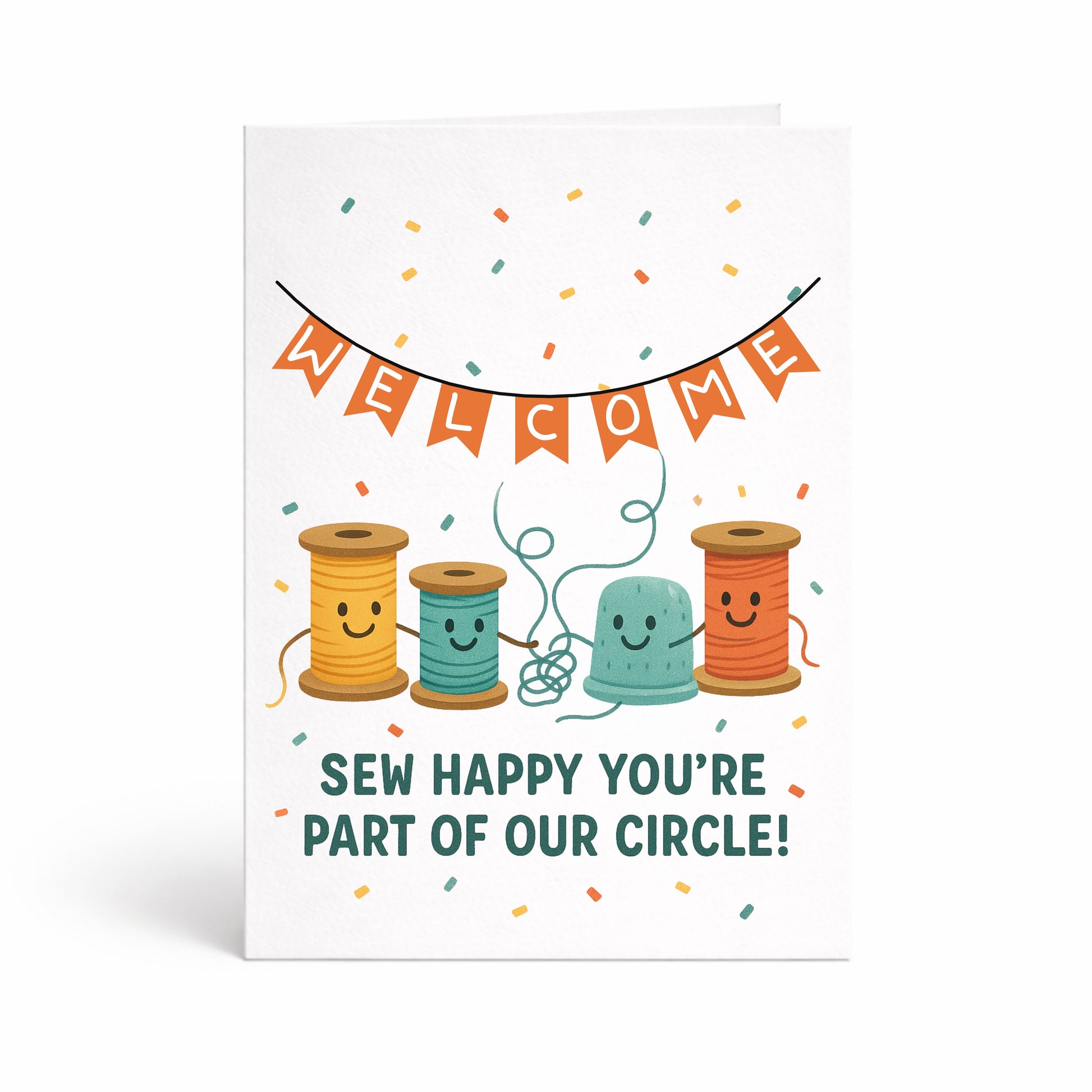 This card is all about community — with smiling spools of thread, a thimble friend, and a big “WELCOME” banner that makes any new member feel celebrated from the start.