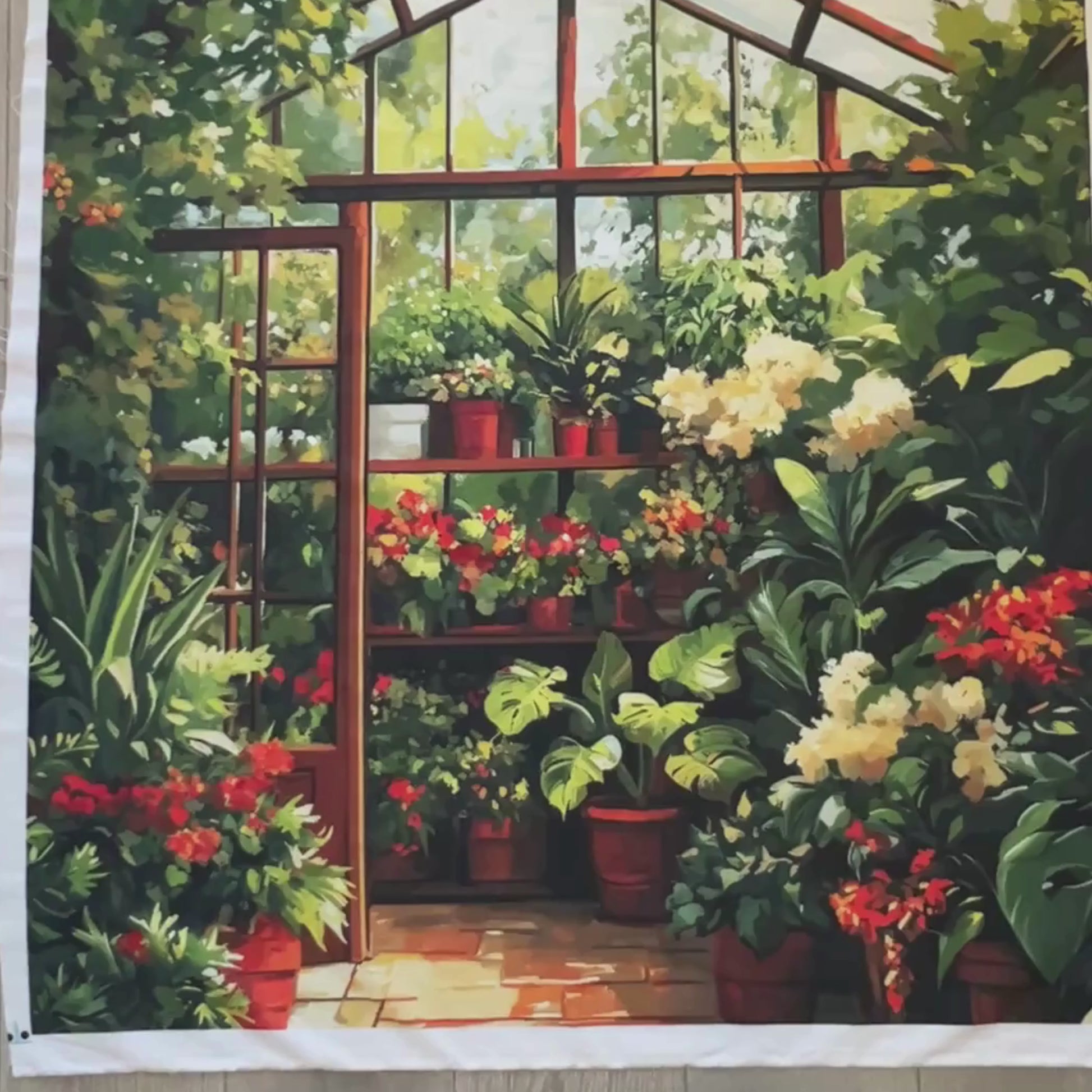 Step into serenity with “The Secret Greenhouse” Quilt Panel, a lush and painterly tribute to every gardener’s dream. This 36” wide by 42” tall fabric panel invites you into a sun-dappled glasshouse overflowing with vibrant potted blooms, climbing vines, and rich green foliage. Designed for adult quilters who find peace in plants and joy in creativity, this panel makes a stunning quilt centerpiece, wall hanging, or even a botanical-inspired throw.