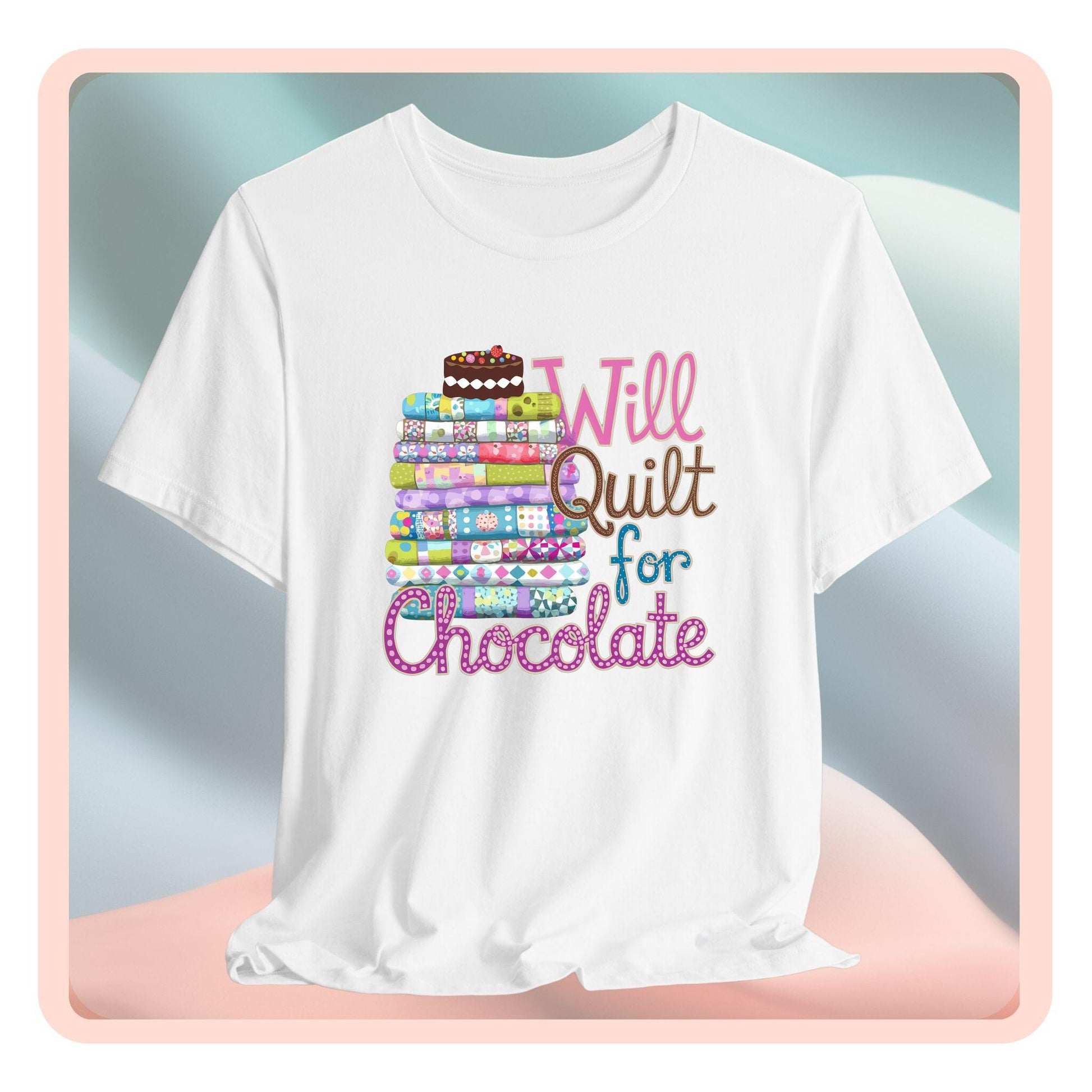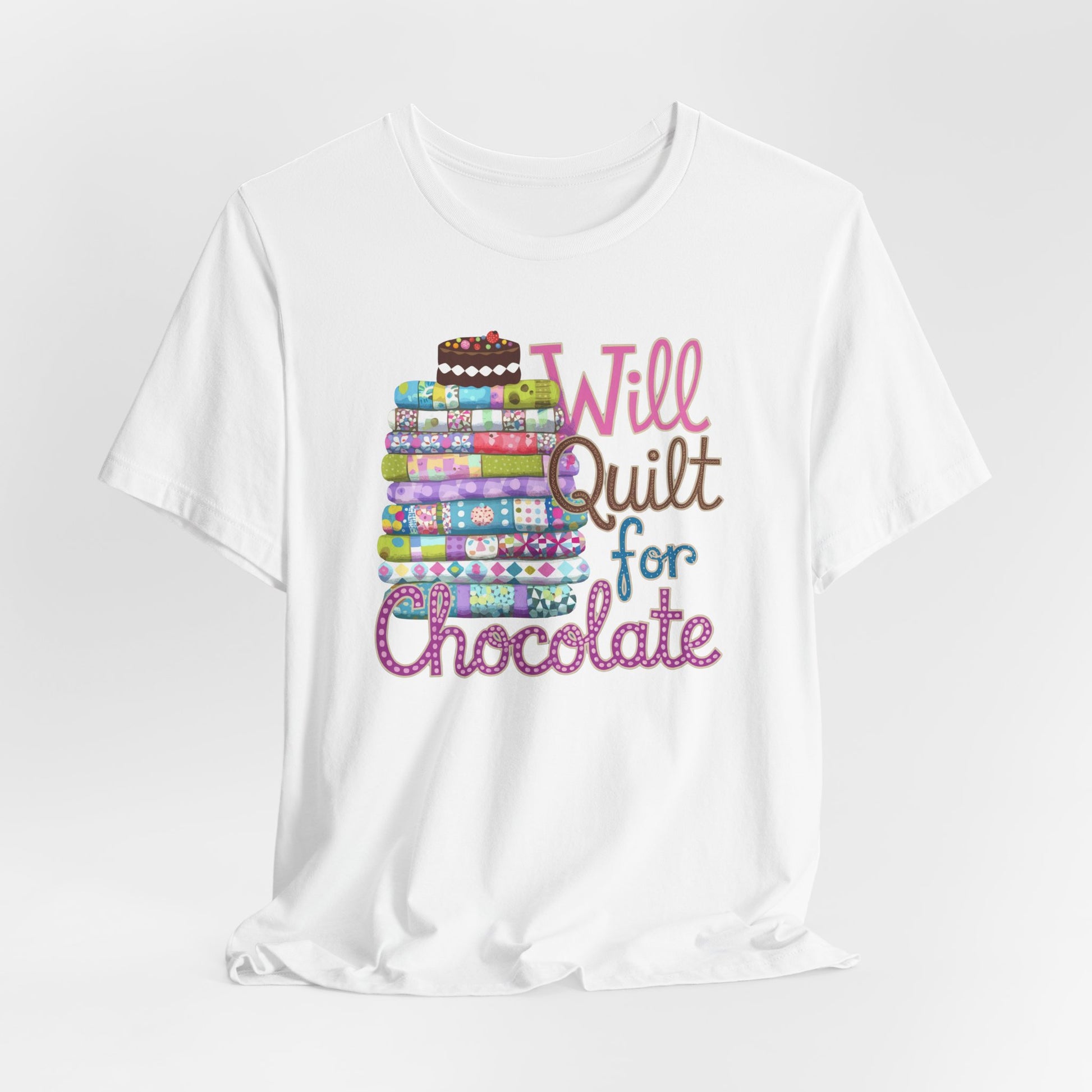 For quilters who can’t resist chocolate! This playful t-shirt features a colorful stack of quilts topped with a decadent chocolate cake and the phrase 'Will Quilt for Chocolate.' A sweet gift for quilting enthusiasts!