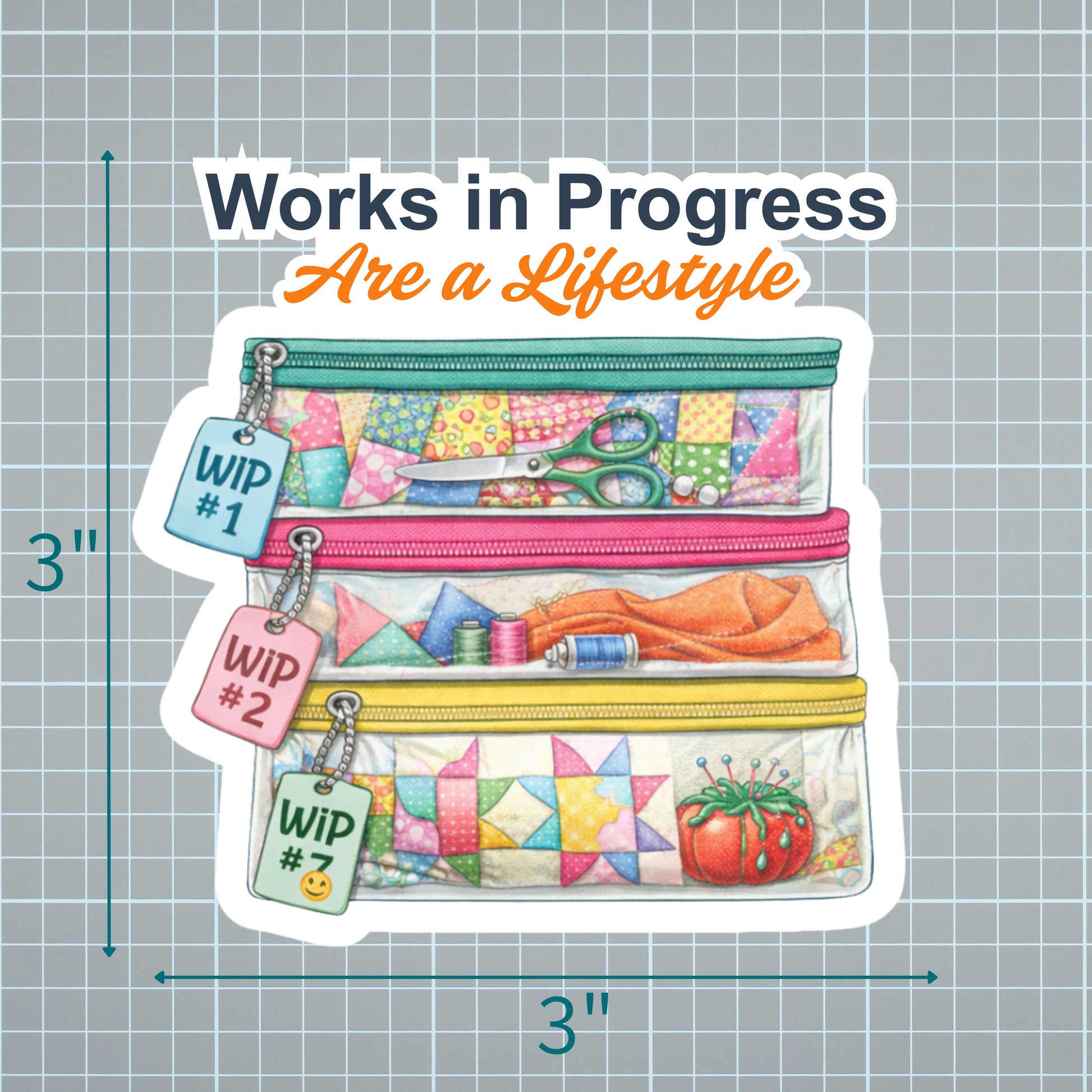 This “Works in Progress Are a Lifestyle” sticker celebrates the happy chaos of quilting with stacked, see-through project bags full of colorful pieces, notions, and WIP tags (because we all know WIP #7 is still totally happening).